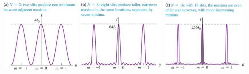 Two different wavelengths show principle maxima @ different values of . Thus, diffraction gratings are used to separate wavelengths.
