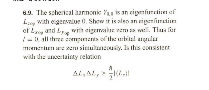 Because the system is already in an eigenstate with eigenvalue 0, the value is already determined and therefore the uncertainty is 0. The question states that the spherical harmonic is an eigenfunction of , and therefore the components of angular momentum for are all 0. This is consistent with the uncertainty relationship because .