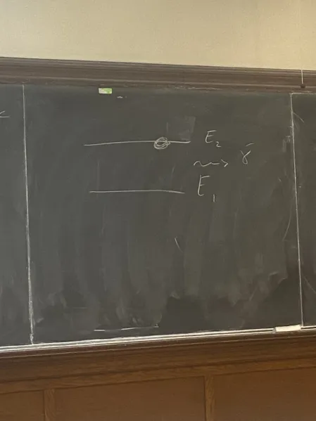 In class 26.1 ω0=−2(1.67E−27)5.6∗21∗1.602E−19=5.6×109 f=2πω0≈900Mz In class 26.2 a. θ=2π, ϕ=0, ψ=2A(χ++χ−) Normalized: 2A2+2A2=1, A=1 ψ=21(χ++χ−) b. 2ℏ(0110)21(11)=2ℏ21(11) Eigenvalue: 2ℏ 26.3 ΔSz=<sz2>−<SZ>2 S^z=2ℏ(100−1) S^2=4ℏ2(1001) <S^Z>=21(1 1)4ℏ2(1001)21(11)=4ℏ2 ΔSz=2ℏ 26.4 Dr. Wertz said there is a 0 probability