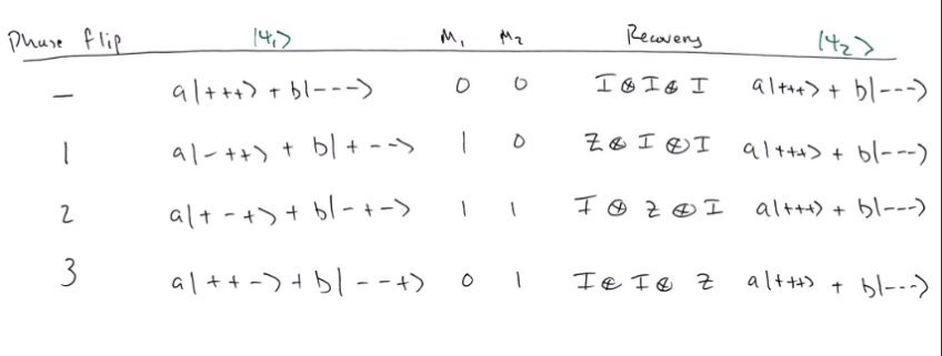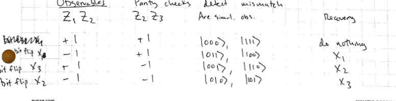 - If there was a bit flip on any one of the 3 bits, a specific state is returned that mirrors the state of the system. You can use this to detect which bit is flipped and recover the system