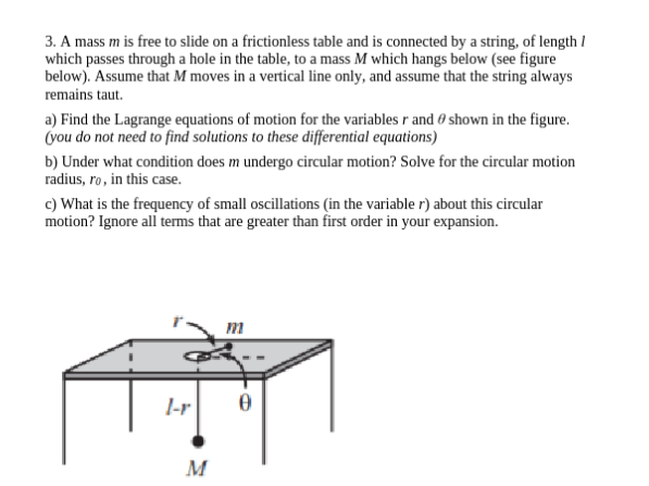We need to define the degrees of freedom for this problem, there exists 2. : angular position of mass on the table : radial position of mass m on table, and coupled to mass M below table